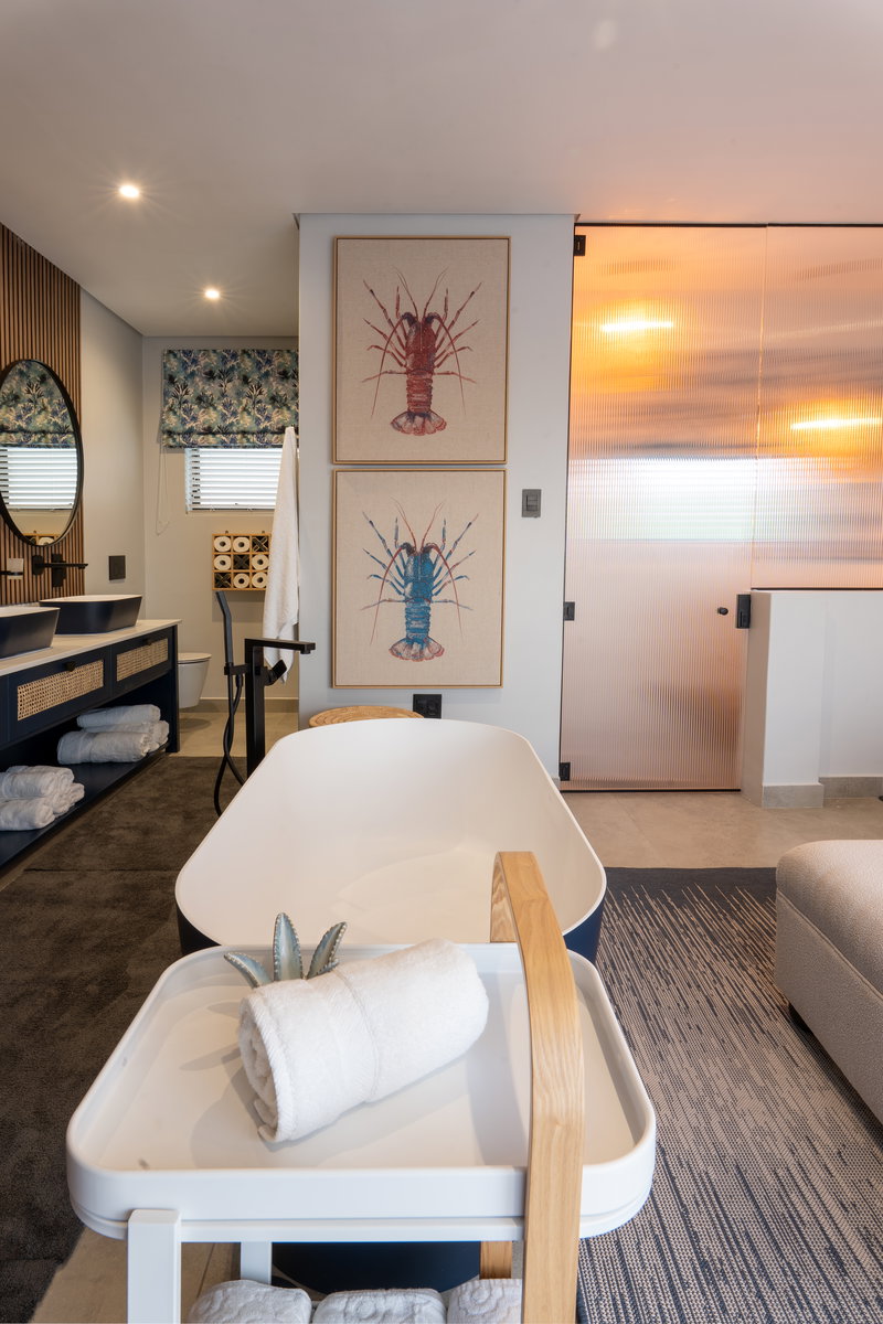 As the main bedroom at Ocean’s Grace, Room 6 offers an elevated sense of space, comfort, and quiet sophistication. The room features a luxurious king-size bed and a beautifully appointed en-suite bathroom complete with both a bath and shower, creating a perfect setting for relaxation